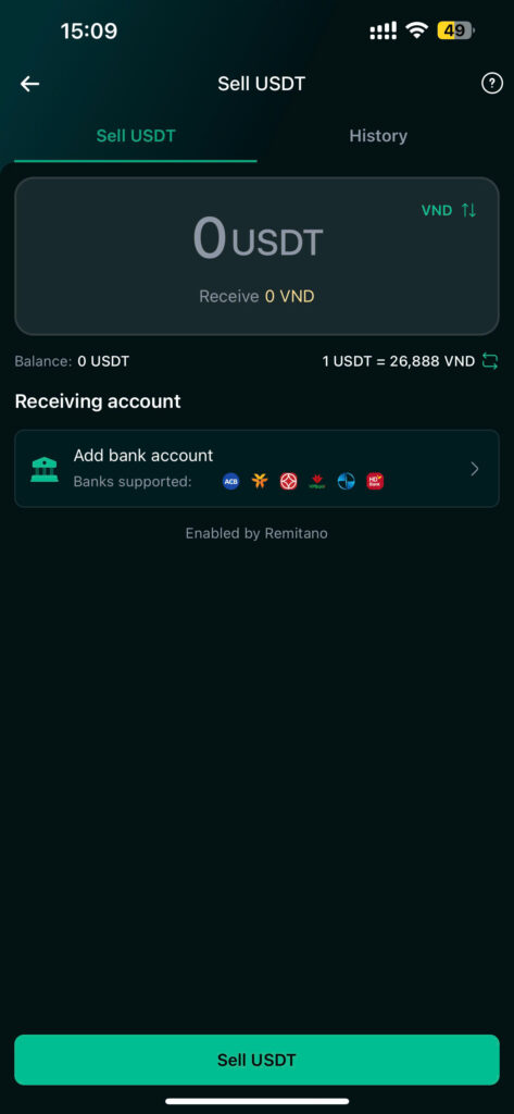 Step 2: Enter the amount of USDT you want to buy and select your payment bank. Then tap “Sell USDT”.